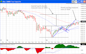 Unless the SP500 move above 1100 to get itself back in sync with the DJI, then it is another sign the market could have already made an internal top. During the recent pull back, the SP500 held the 1025 support and move back above the 50 SMA. In the last session, it was testing the resistance level near 1070. If it failed to push through this resistance level, the SP500 could be setting itself up with an H&S pattern.
